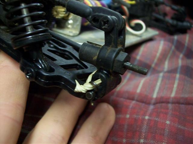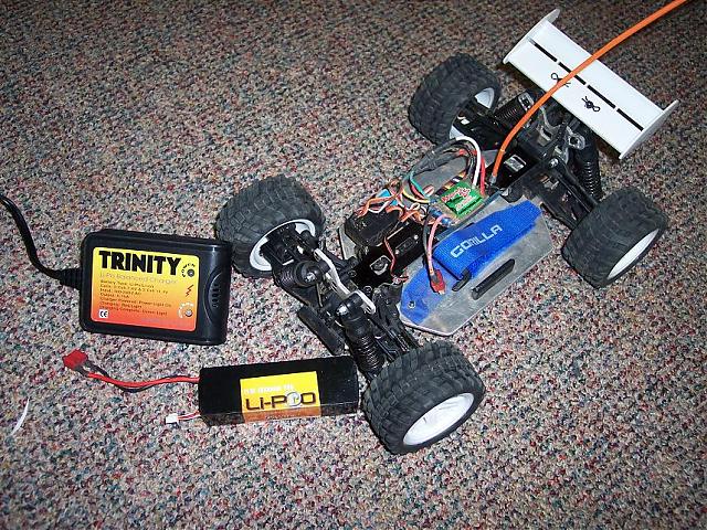 ----Trinity now, ran 14-15 times on 2s (till crapamps pack died), ran twice on 3s, comes just like you see it, with my 3.2mm chassis i made for it and gorrilla strap to accomidate different packs, i have a spare spur gear for it and i put a new one on it as the last one had got a little chewed up. you can tell from the body and the under chassis pics how much this truck has used. I did loose an e-clip off a rear suspension pin and i could find one in my box so i used a mico-t bodyclip it works fine but i dont want there to be any surprises. here is a link to where i made the chassis http://www.rc-monster.com/forum/show...hlight=trinity