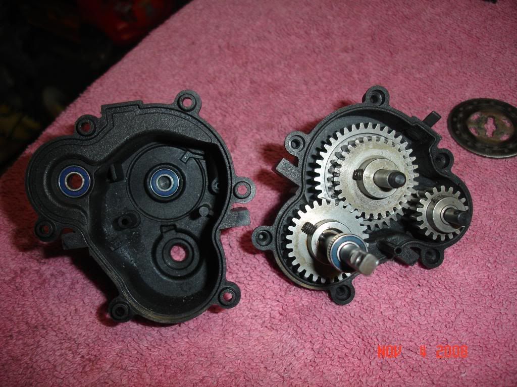 Here are some pictures of the tranny I modified for the brushless revo. I converted the revo 2 speed to a single speed locked in 2nd gear using an adapter plate I bought from Oomp(one of the guys over at traxxas forum).