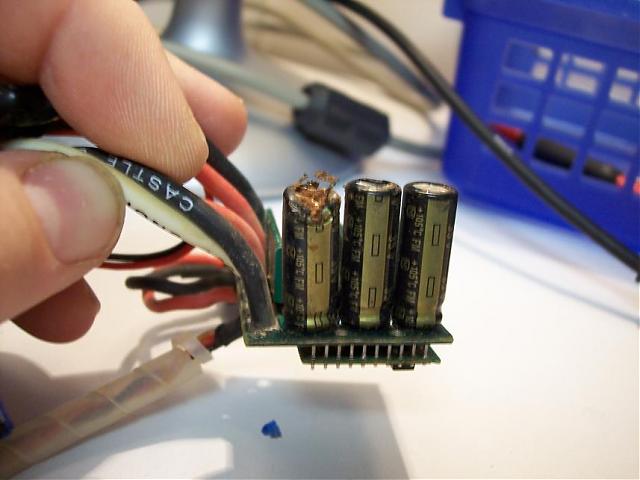 One cap is completely toast and is about to fall off since it has come loose from the board, the middle one next to it has a nice fat dent in the end of it but is solid on the board.......id like to replace both but i dont have any of these and i dont have soldering iron until christmas (gave the hobbyshops back and even after christmas i wont have the right tip) ?????? what to do? can i just cut the busted one off and run on? i have an 1800 35v external cap along with all the other mod1 stuff from arthur.