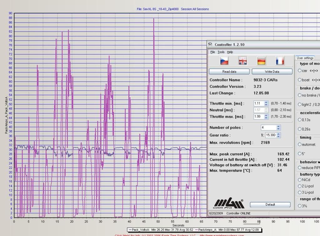 EDIT: I DL'd from the ESC, and I'm not so sure its so far off. The max current is high, but the current at WOT is only 102A. That's not that far off from the ET data @ 90A (who knows how accurate that really is), plus the ET is only set for 8Hz. It could cert miss a micro burst or top of a peak. Notice how close the voltages are, and I know the voltage on the ET is right as I spent quite a bit of time calibrating it. The temp readings are also close to what I saw.