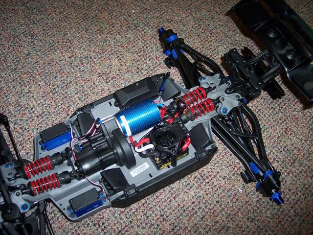 well it started as the brushless edition revo, he wanted a better racing setup so we ditched the castle nue 1515 in favor of a tekno neu 1512 3d 1700kv motor, it will run off a pair of 6s 2500 RC-M lipos in paralell for 6s 5000, tekno swaybars will be installed, along with zero offset bowfighters or holeshots, we are using the monster's setup as a starting point for dailing it in.