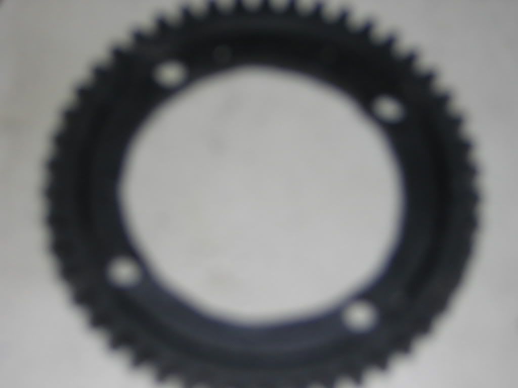 I took a 46t kyosho plastic spur, and had the machinist open up the center hole so that it fit around the diff cup. Then I took the steel spur to the grinder and removed the teeth and a little more. So basically I made a backing plate out of the steel spur. It is hardened so drilling it was not an option. I made 4 slots with a fiber cutting disk, and then drilled 4 holes in the plastic spur. Bolted the spur to the backing plate with nuts and bolts, plastic spur on the diff cup side. Last I made some 1/4" or so plastic spacers to put under the diff bulks to raise the diff enough so that I did not have to enlarge the hole in the chassis.