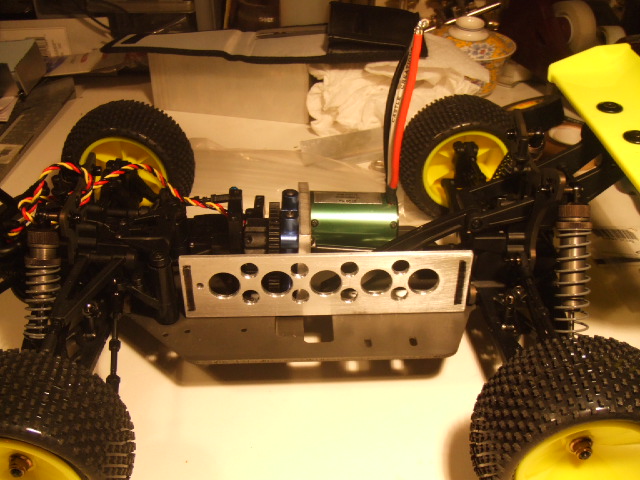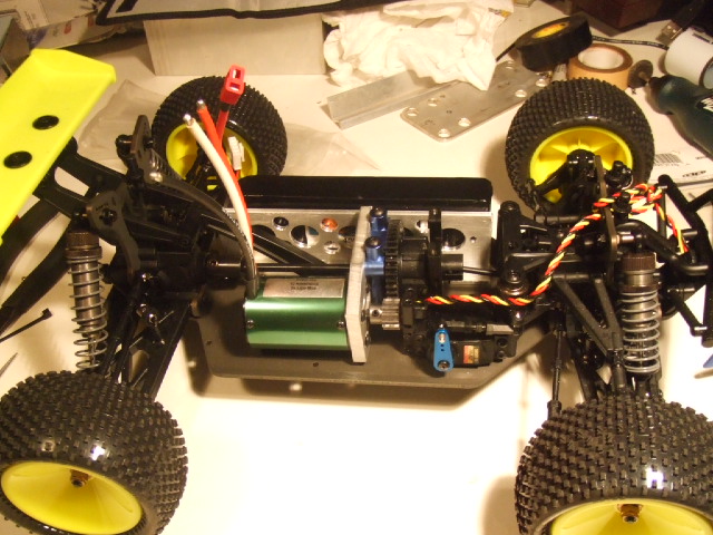 I went with the Kyosho 46t spur to keep the pinions reliable I stole some parts off my full size CRT the rear aluminum diff mount and drive cup and pin for the diff gear along with the front center shaft off my HPI savage. I also moved the center diff over to the right side of the chassis to get the battery closer to the centerline and also allow more room for a 4-5s pack later.:)