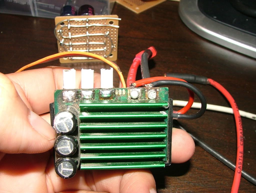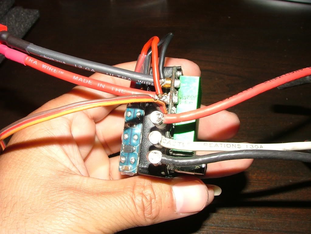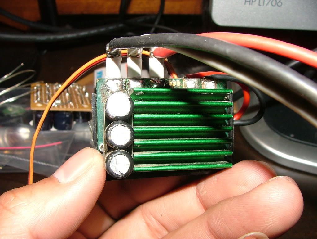I've decided I got tired of the same 'ol look of the Mamba Max and did something about it. Took out the wires and soldered plugs instead. Power wires were upgraded from 13AWG to 12AWG. Motor wires were left stock and got 3.5mm plugs on the ESC side. This time I can mess around with different motor wire lengths in all my cars without being stuck with wires that were cut too short. I used Lutach's 25V capacitor bank for that extra touch of gangster.