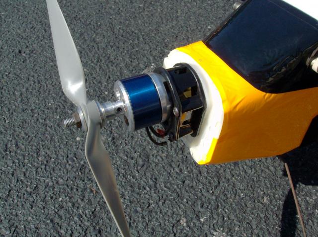 Now let's talk POWER :) I'm using a Waypoint 3014-16 1300kv- http://www.allerc.com/product_info.p...oducts_id=3860 on 3S with a 17,000 RPM theoretical max. Eliminating the gearbox makes for a much smoother sound and feel. But you'll want to maintain your downward and right offset to the motor as it counteracts torque roll. This is done by cutting the nose off the gearbox molding, and retaining the rear half. I am using a Castle Thunderbird 54 ESC, just for lots of headroom to prevent thermaling under prolonged full throttle. The max draw with this motor is around 35 amps with an APC composite 10x7 prop.