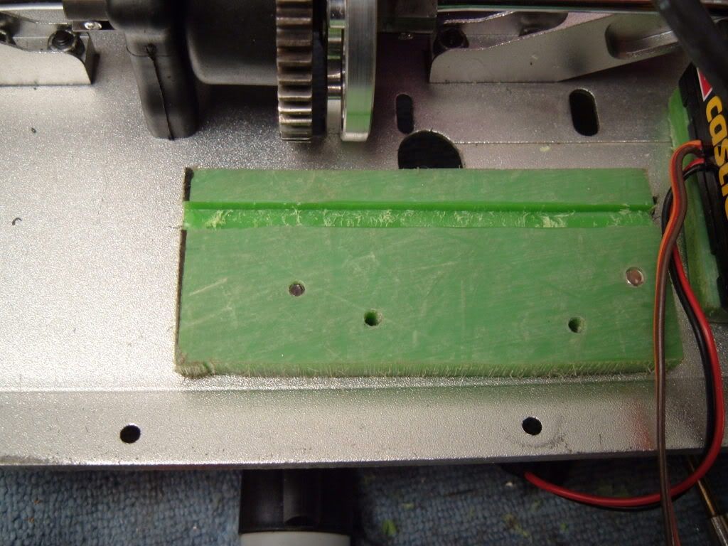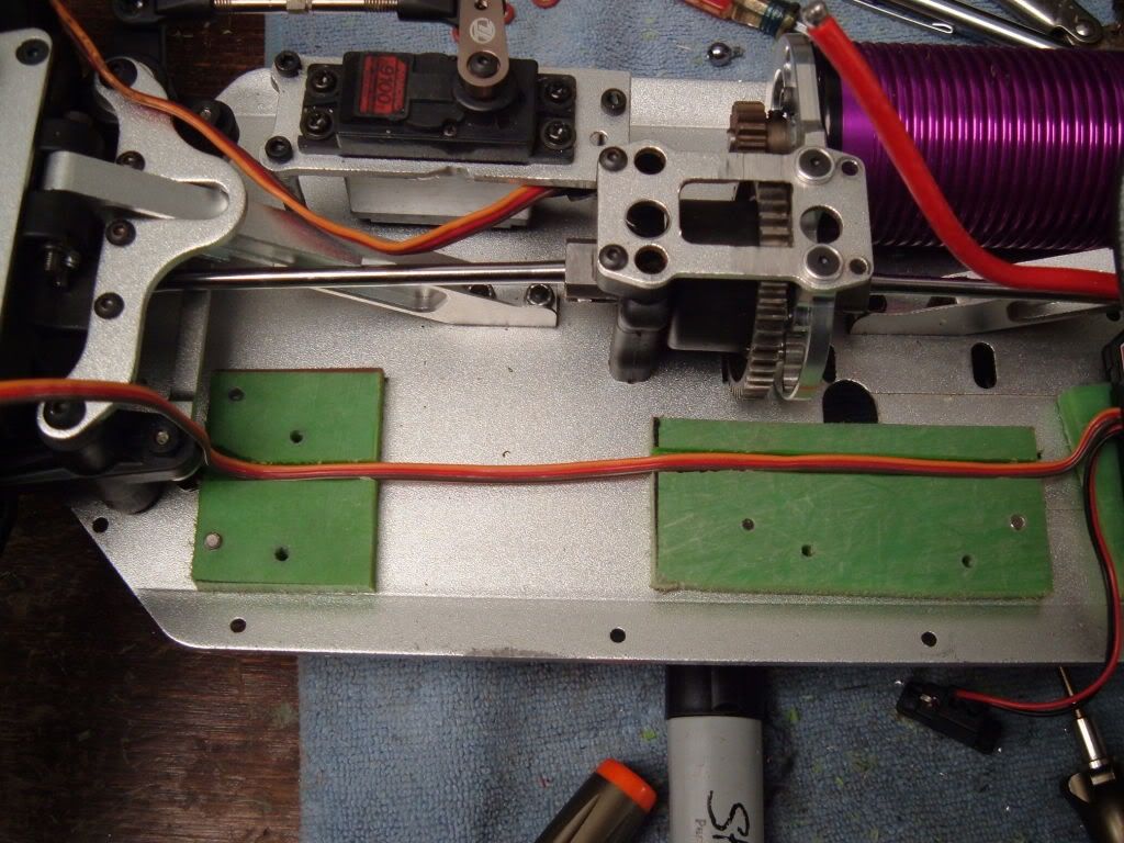 Power system is a hacker c50 11xl (1476kv) with a MMM on 6s lipo. Stole the battery tray out of the lst, and made some risers out of delrin to clear the raised edge of the chassis. Made an esc mount out of the delrin. All of the delrin mounts are held in with screws thru stock holes on the chassis. I have not drilled one hole in the chassis. I also took the router to the delrin risers and made channels in them to route the MMM signal wire to the rec. Did the same to the esc mount so that I could put a ziptie on to hold the esc down. First time I have seem this, keeps the wire out of the way, and safe too.