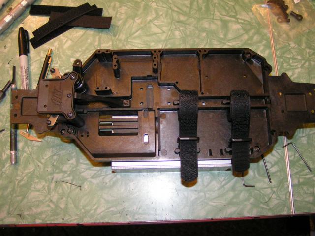 Step 1... make 2 modifications. The first step was to install battery straps... the ones they give you are just 2 pieces of velcro; 2 hook and 2 loop, no way to pull them tight (they just overlap). First mod was to use 8ight-e straps and second was adding a piece of servo tape under the clamps that hold the straps. I was worried that the straps could pull out from under the clamps without something else to help hold them. First pic shows my modded straps and you can see the straps they give in the second pic (sitting on table).