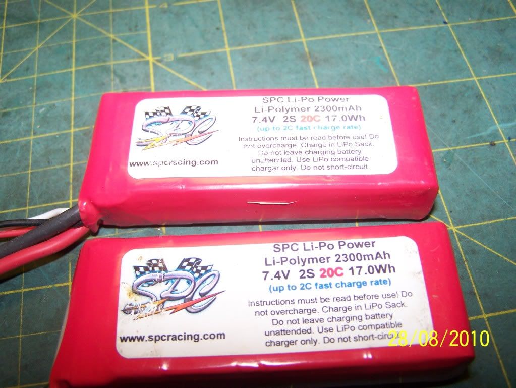 2x SPC 2300 25C 2s LiPo's I run them as 2s2p for long run times.