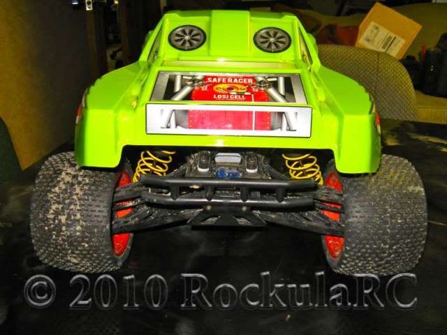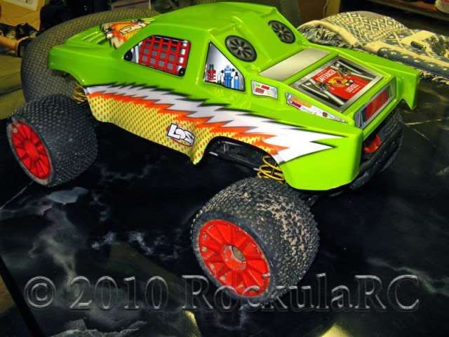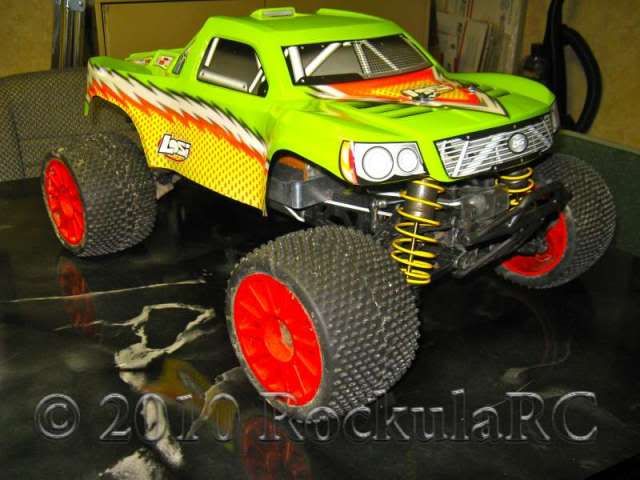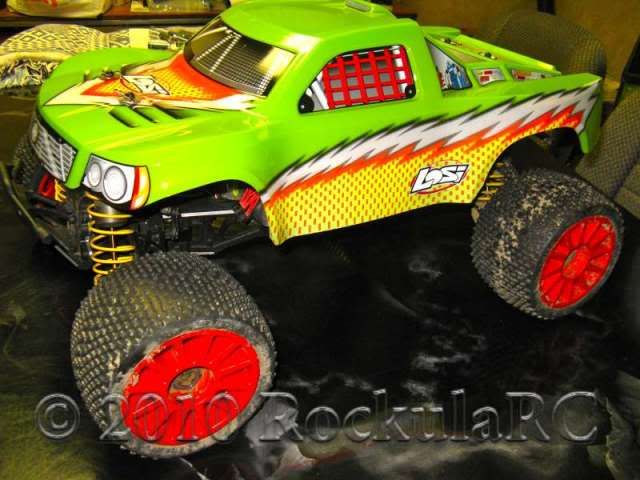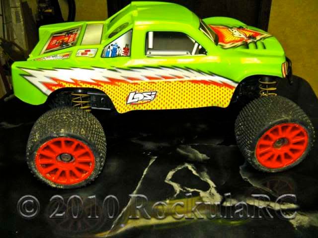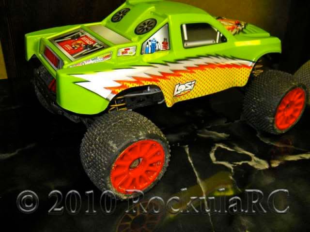 The specs of my truck are 6S MarinePower 5000mah Lipo, Neu 1515 2.5d, MMMV3, XXL HD Cups in the diffs, RC Raven Springs with 30wt oil, Single Steering, KoPro 2368ICS Steering servo, 23mm ProLine Rims (yellow dyed to orange), Pro Line 40Series Bow Ties, New Era Nitro Roll Bar converted for electric by Bondonutz. I also have the stock Losi Truck body in Red and this Strike body. Both bodies are Gorilla taped inside for durability.