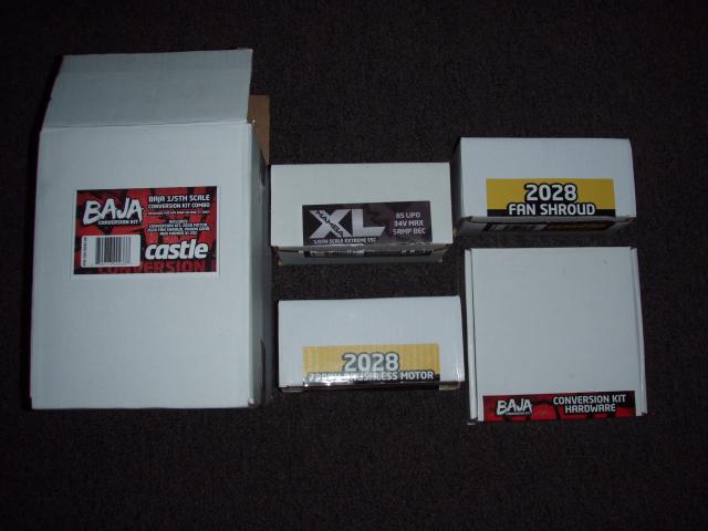 I'm selling this brand new Complete Baja 1/5 Scale Conversion Kit that includes speed control, motor, fan shroud and the conversion kit. I bought this on 1/26/2011 and only opened it to look at the stuff then I put them back in the box. I changed my mind on building a 1/5th brushless car and I'm sticking with 1/8th scale. I have the sales receipt of when I bought it that I will included with the kit. Please email or send a private message for price, will take paypal or can meet up somewhere locally for cash payment. If you have any questions please email me at