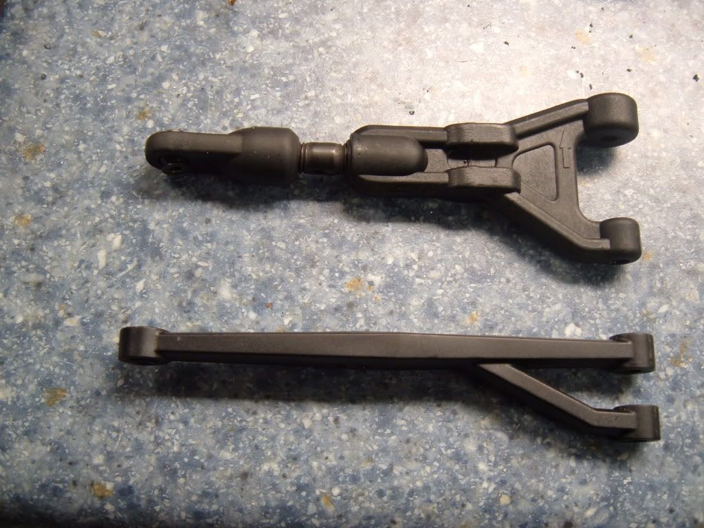 Cen lower arms, next to a savvy arm. Suprisingly the cen arm is shorter than the savage arm, and it uses much smaller hingepins to attach to the hub.