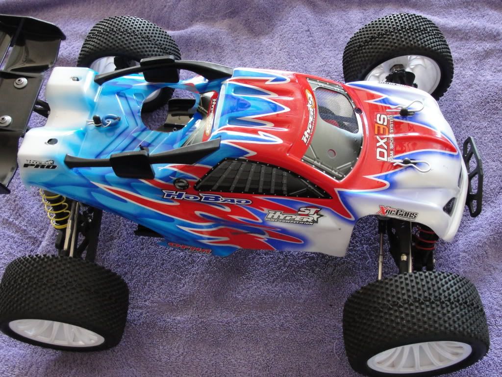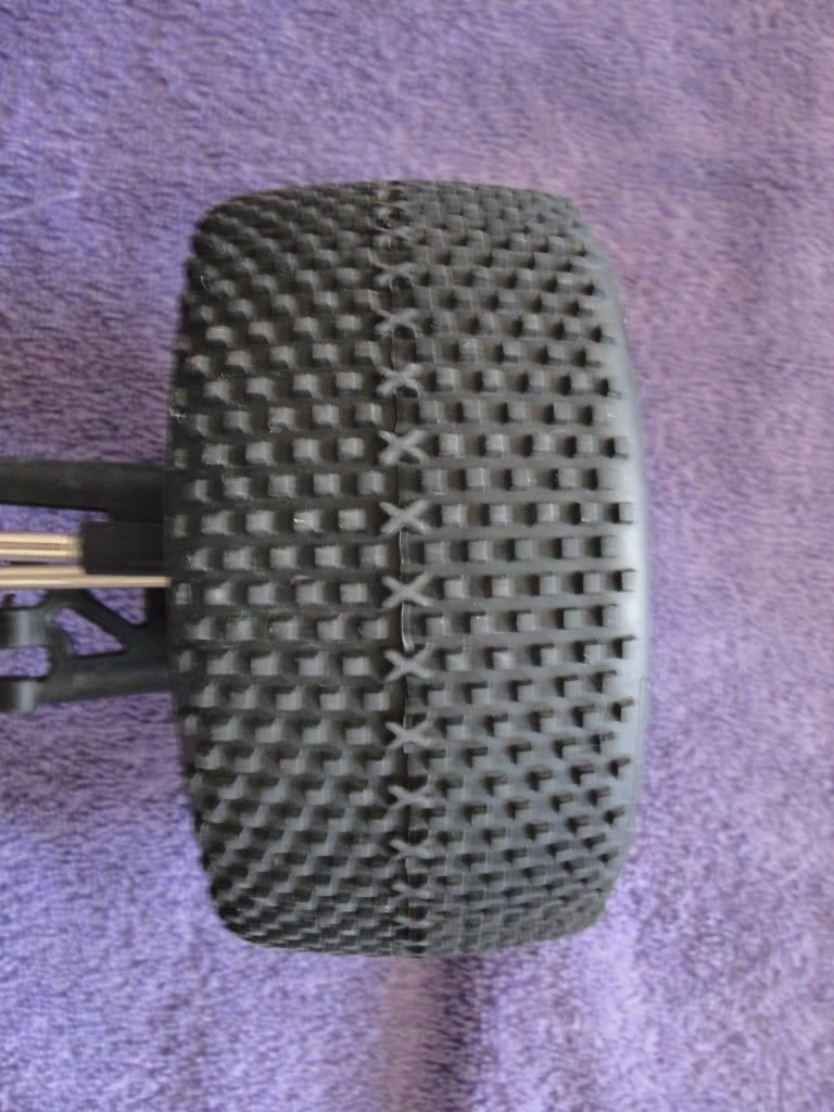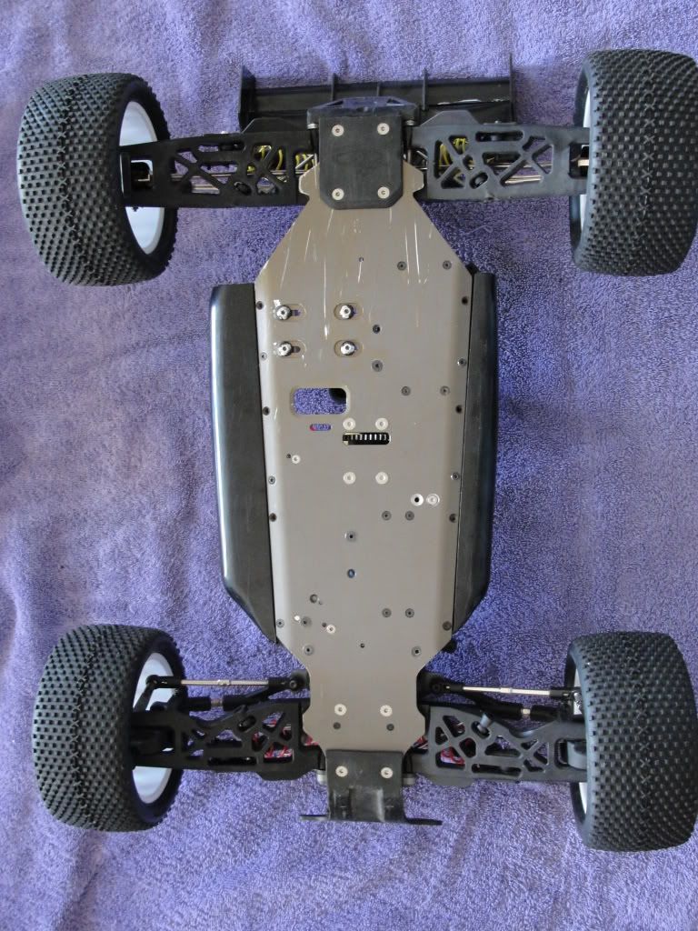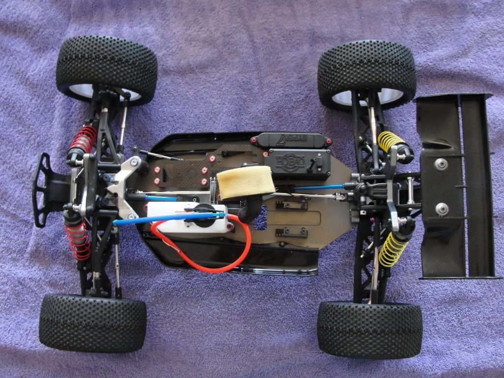 This truggy has mugen tank, O'donnell big bore shocks and assortment of springs, RC8 chassis braces, Losi 8ight side guards, Jammin center diff with Kyosho lightened spur gear, better Ofna motor mount, a set of like new tires and a body. It really impressed me how clean it was, though you can tell its been used. The only "issues" so to say are non-matching inner camber link mounting hardware on the rear, and slight grinding on the gear adjustment slots for clearance.