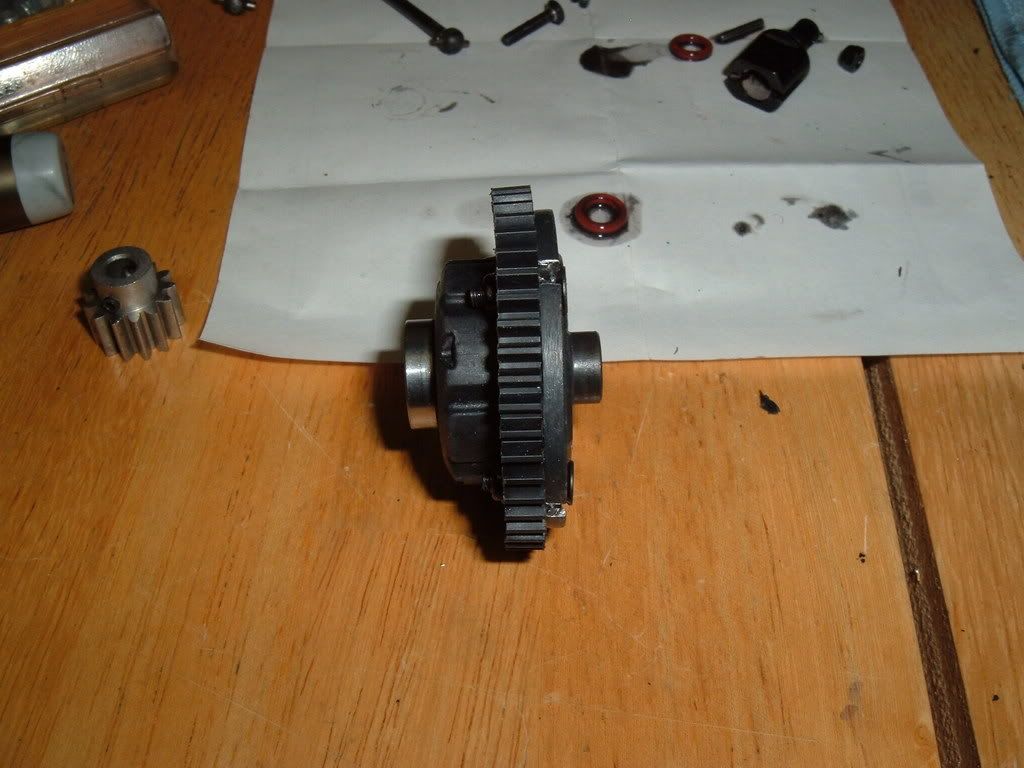 I did try to come up with a setup that used the Kyosho 46T spur, but the CD mount would have to be moved (new holes redrilled) and the shaft shortened. Also, the outdrive cups used different dogbones. It's easily possible, but not without some custom parts.