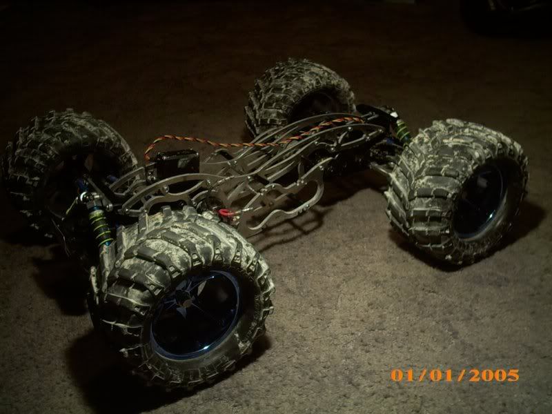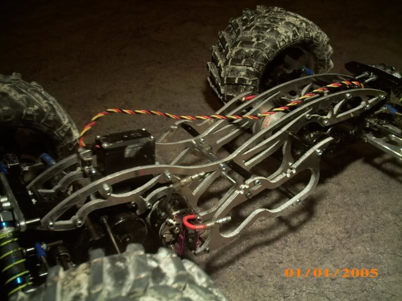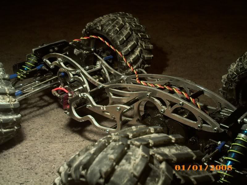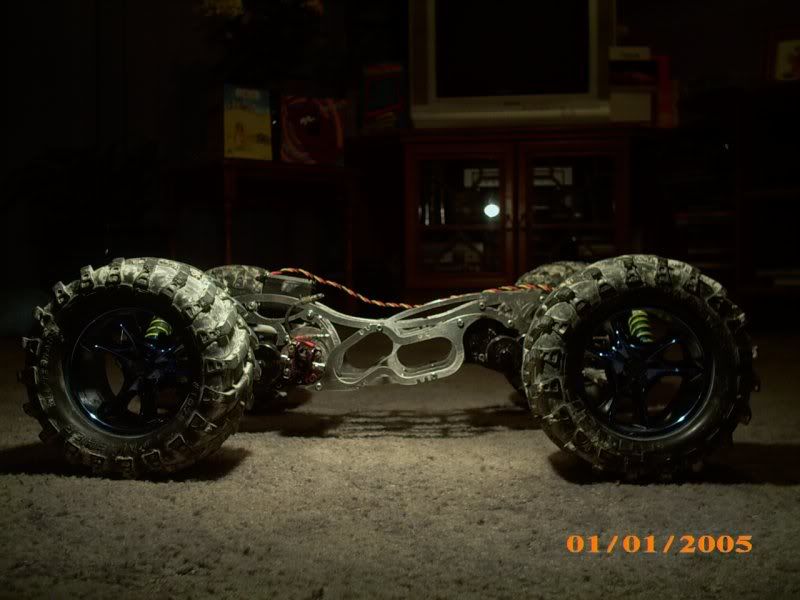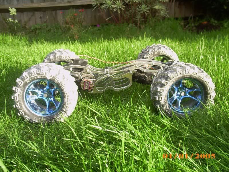 The entire chassis is CNC plasma-cut from 4mm aluminium and is designed for maximum strength, minimum weight, and lowest possible CG. It also incorporates 10 degrees front caster for straight-line controllability, gives a wheelbase of almost 13" for maximum stability, and has a capacity for up to 16 cells with special battery supports (which incorporate hooks for using bands to hold the batteries in)....just haven't test driven it yet! Ultimately the chassis will run the dual brushless system I've been yabbering on about for the past year, so hnadling and strength is key...