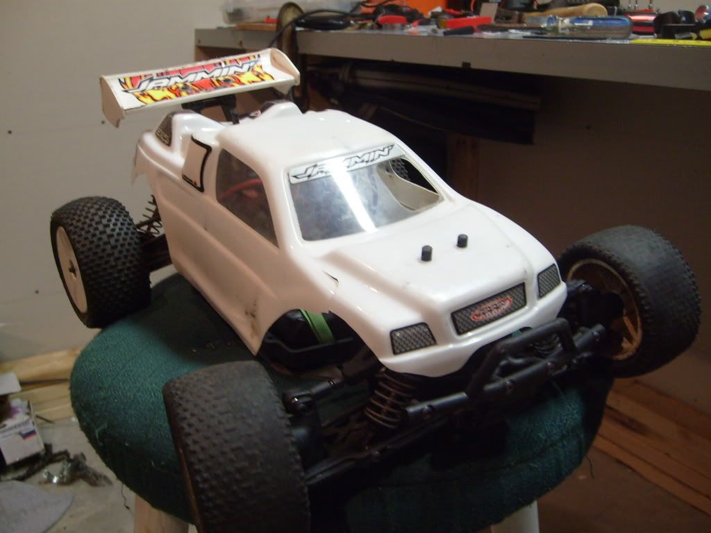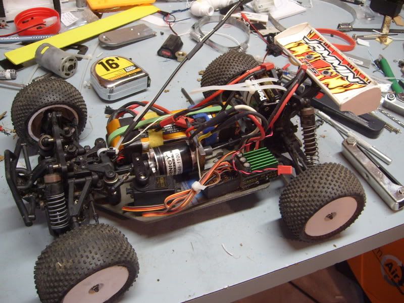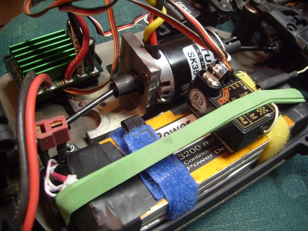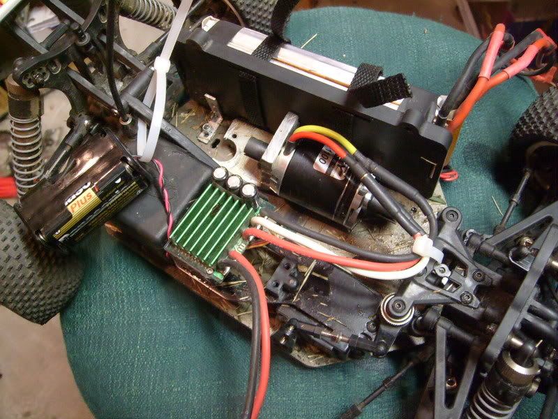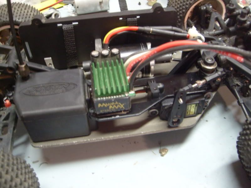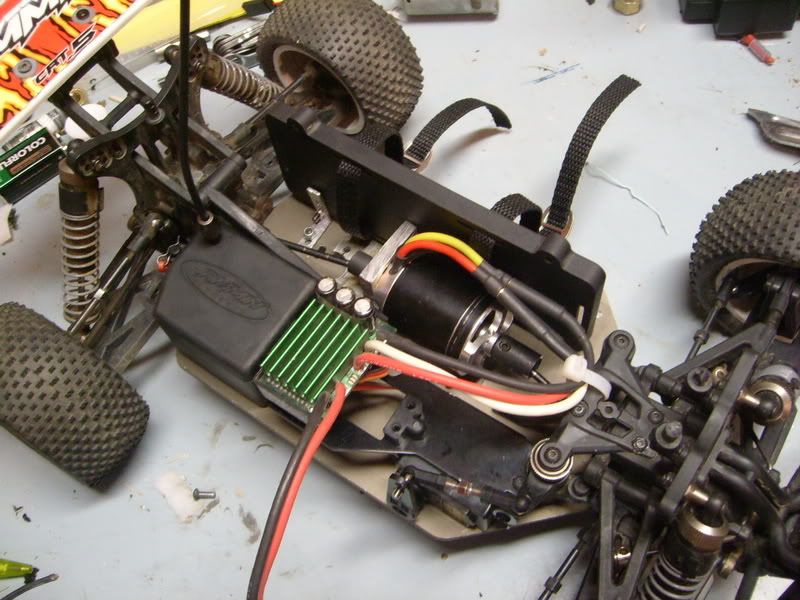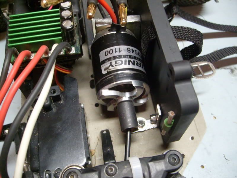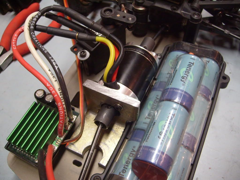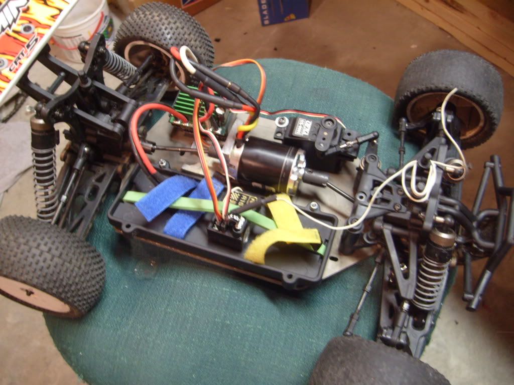 I've pretty much finished up my crt .5 now. I am running a Flightpower 30c 3200mah 3s lipo, Turnigy 1100kv 36mm outrunner, and a mamba max esc. It is still a work in progress. I need to get better battery straps, secure the battery tray more, make chassis supports, shrinkwrap the battery, mount the rx in a better place and get an antenna run, get a better wheel/tire setup etc. The ones on the backs in the picture bind when in the front and the ones on the front don't have enough hexes to be run on all four wheels.