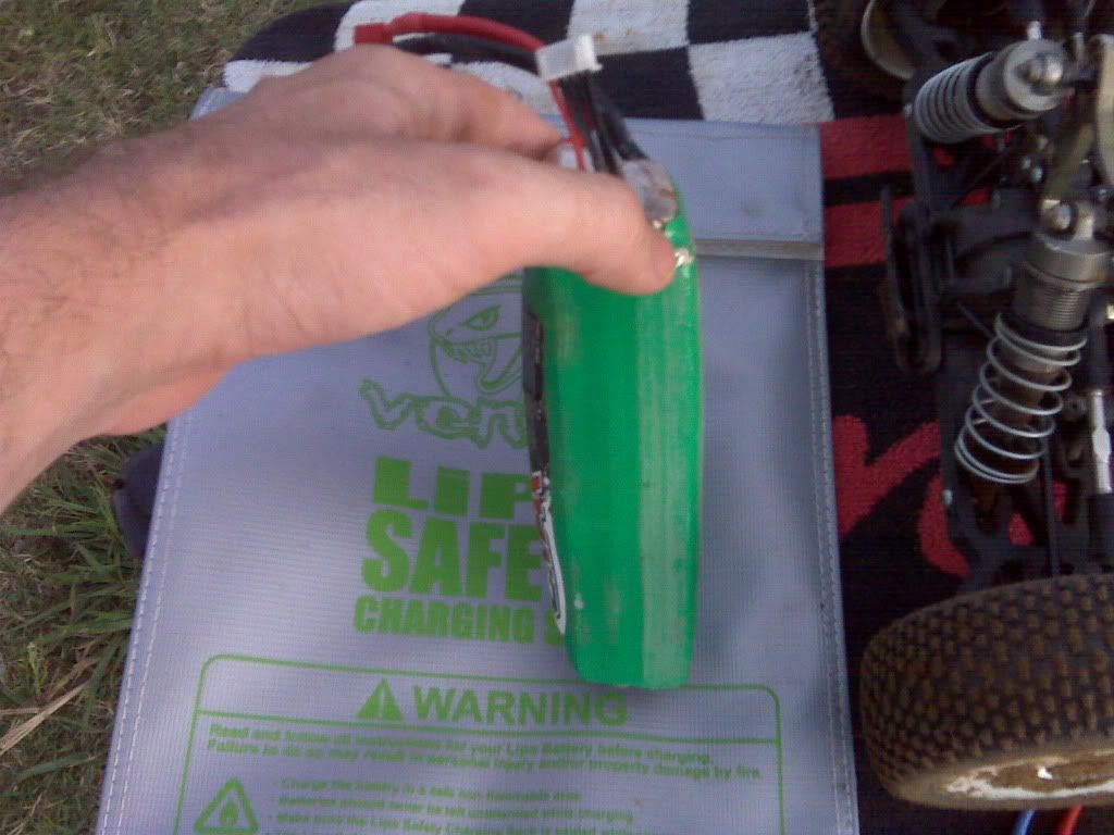 I would think this battery was around ~160F coming off the track. He ran this battery for 4 races, charging between races. Charging it seemed to make the puffing go down. By the end of a 6 min heat it was puffed up like this. Just thought everyone would enjoy seeing a puffed battery.