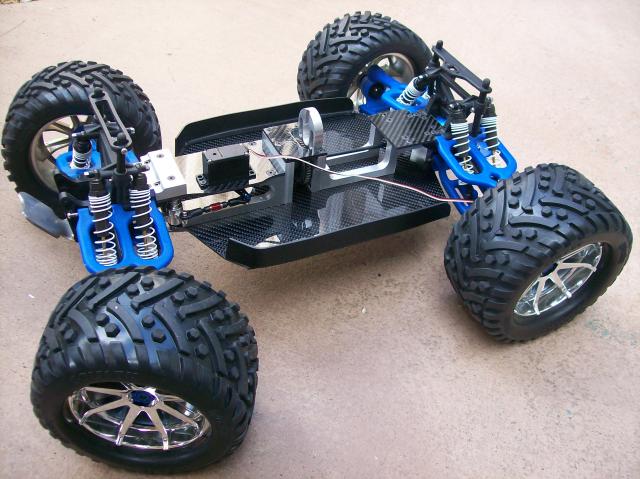 The aluminum chassis in the picture (for example, not actually size was from a prior build) is going to be Carbon Fiber that gets sandwich between the aluminum braces and a titanium e-maxx skid plate. It goes all the way to the e rear with no skid plate. I only used the front skid plate to keep the kick up.