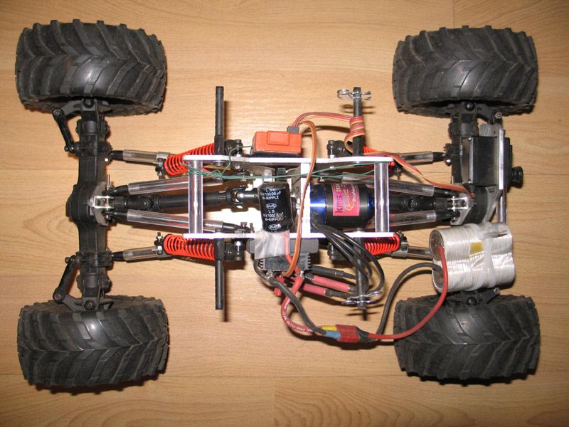 After having wanted a crawler for a couple years, I broke down and bought a Wheelie King a few weeks ago. Just for kicks I removed all of the electronics from it and installed a Johnson 550 12v motor, EVX, a 2s 6400mah Lipo, and my radio (so I can sell all the stock stuff as "brand new"). The thing did wheelie like a "King", but couldn't do anything else. At that point I took the whole truck apart, with the axles separated from the chassis. I will only be using the axles and possibly the shocks, as the chassis is quite worthless (except I will be using 4 holes from it as a template). Here's what I am planning to use: