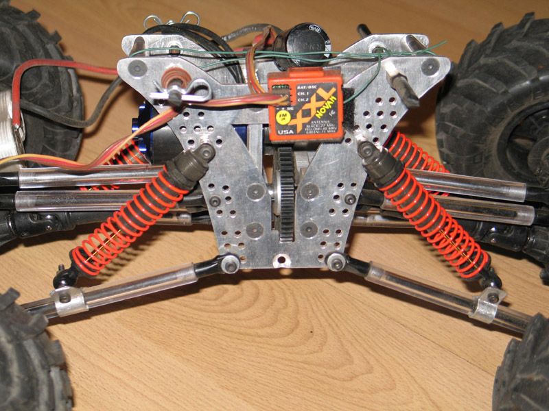 So far I have the servo mounted to the axle, and the lower links are finished. Next I will make the upper link mounts on the axles out of some aluminum u-channel, and after that it will be time to design and cut the chassis. I'll get pics up as I progress.