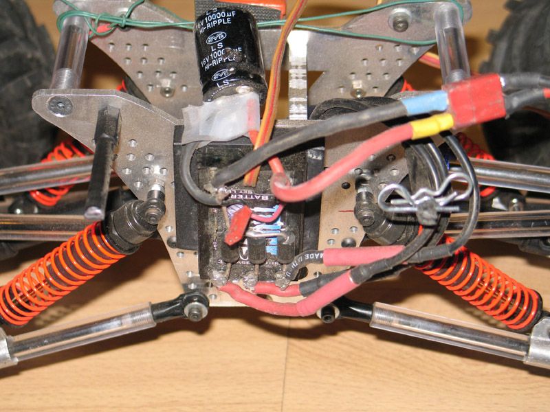 At work today I just about finished the truck. It's definitely in driving condition (I drove it after work). It's only missing the center skid plate, since I haven't gotten around to making it yet. I slapped in a Mtroniks Genesis Truck ESC since it's the only working one I had laying around, and I must say, it is quite smooth. In fact, everything about this rock crawler is smooth. The drivetrain is smooth, the motor spins very smoothly, the suspension acts smoothly, etc. At work all the guys were rather impressed, but half of them haven't seen it yet, and they're used to seeing this sort of work from me :004:.