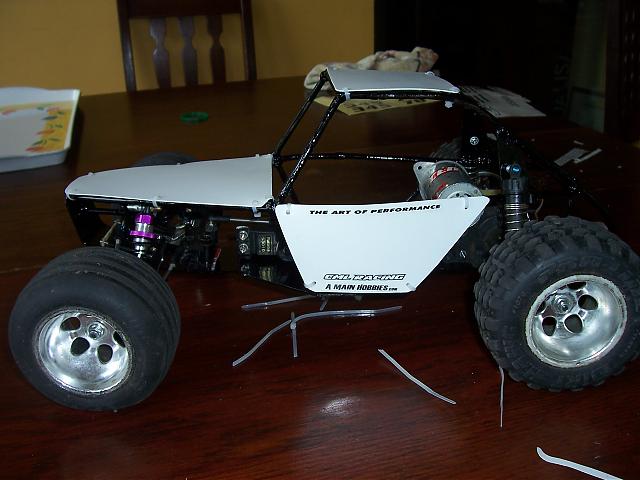 Here is where I am at now, chassis painted and panels on. I still need to make an esc mount and some sort of battery holder but that will have to wait untill my A123 packs come it. (Sorry the pictures are rather dark, I'll get better ones tomorrow)