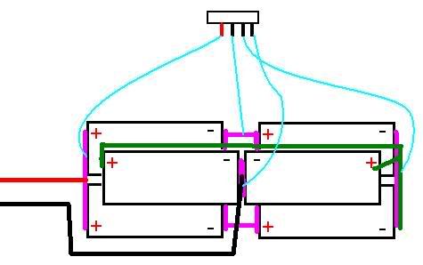 I know i know its terribly difficult to explain. The picture i linked to is a 6s1p which is easy to wire. Your drawing is good enough, and makes more sense. I drew it up too, pretty much the same way exept. I basicaly would have two sets of 3s were you would have the the 2 negative ends meet and become the negative battery lead. and the two possitive ends meet and become the possitive batt lead. But looking at yours. Im thinking my way would only have two cells wired in parallel instead of 3. If that makes sense. I looked at the wiring diagram on script's site and i imideatly new i was thinking the wrong way. But to wire a 3s2p pack in that 2x2x2 like pictured,is a wiring nightmare, even without the balance leads. your still using a ton of wire and soldering joints. Im thinking maybe it would be better just to make two 6s1p packs and buy a 989 charger or something else that will charge 6s. hmmmm