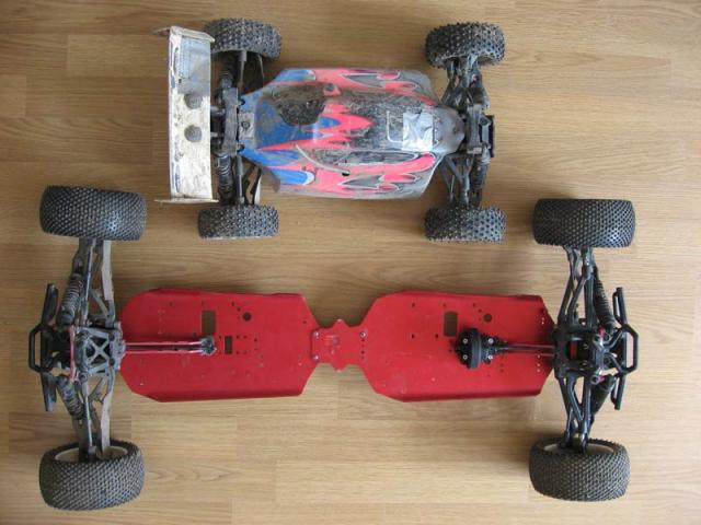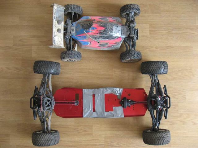 Compared to a baja it is still too narrow. Baja: 460/480mm opposed to 430mm. This can be corrected somewhat with wider wheel hubs. Truggy wheels (145mm) are smaller in diameter than 1:5 scale baja tires (170mm). To be able to use 1:5 scale tires would probably require custom made wheel hubs. The chassis would need a top deck to strenghten it and might need to be narrower to fit a baja body. At least one custom center cvd is required ... cutting an original one in two halves and lengthen it with a metal tube should be an option either. Shocks would have to be adapted to carry more load.