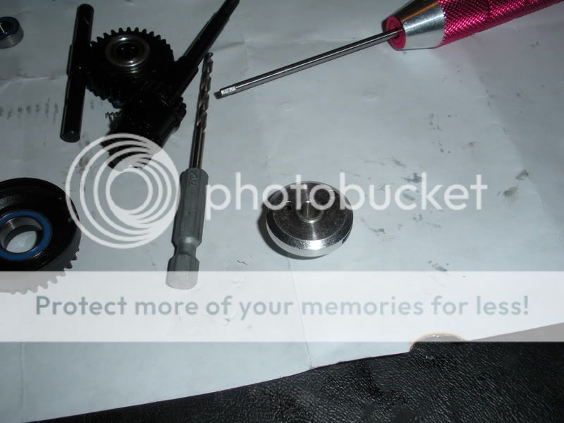 Next you can drill 1 or 2 holes for the Pins..Make sure you go far out enough so it doesn't get in the way of the Bearing and so the gear is the thickest on the outside.. Just make sure you don't drill through it.. You can even use the bearing as a guidelin..You can drill either one or 2 I used only 1 since I am using 1/8 wheel pins..It should fit snug...