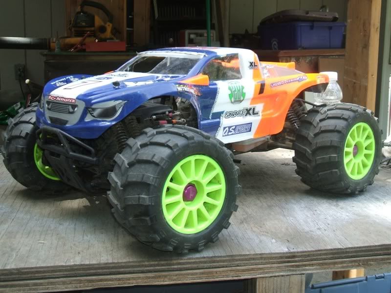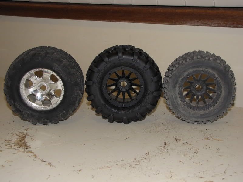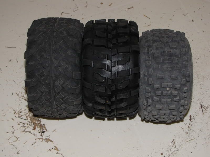After reading some forums i went to the Proline Badlands(MT size) on 17mm 1/2 offset Maximizer beadlocks. These tires have a phenomenal amount of grip offroad. Some of the hill climbs i've done with them have really suprised me. Looks wise the tread pattern suits well but they appear too small on the truck for my taste.