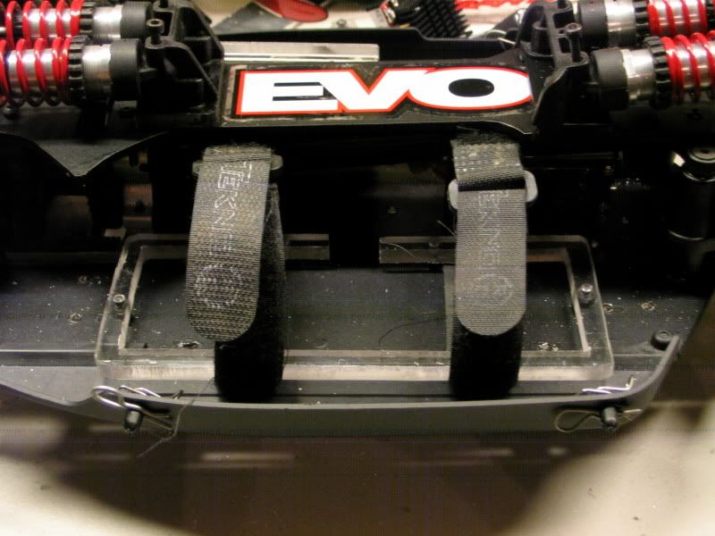 Today I didn't have any homework so I was able to make further progress on the buggy. I redesigned the battery tray and decided to keep it simple. I just used some 1/4" lexan to make a "craddle"/Tray then used some tekno velcro straps I had laying around. This holds the battery in very securly and I am able to hold the buggy upside down by the battery haha