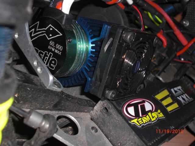 On another note.. I received the vehicle yesterday. Radio hasn't arrived yet, but no biggie as I used my Spektrum stuff anyway. I gave everything a quick once-over and took a maiden voyage. A bit disappointing at first. Handeling wasn't as good as the converted Muggy I have. Upon further inspection, I noticed that one of the wheels wasn't balanced, and both front shock shafts were damaged. Ah well.. such is life sometime.. right? I modded some wheels to fit, straightened the shock shafts as best I could (going to order some new ones). Finally, I've installed a fan/heatsink on the 152o motor. Not necessarily because it was needed, but the heatsink actually acts as a support for the long motor when turned so that the fins touch the chassis top plate. And the blue color matches the shock bodies and front/rear diff covers. I'm getting happier now..
