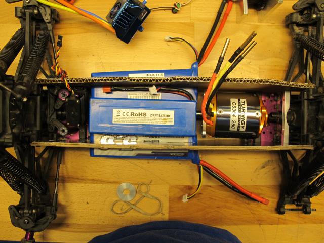 Hmm... with a skid plate and some sort of dogbone protection the batteries could be squeezed in between the TVPs. Motor mount was made with a centered 1717 since this allow me to push it further back.