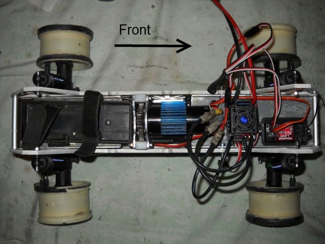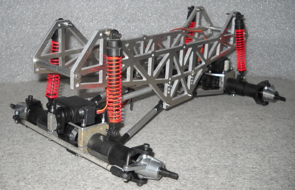 Version 2 with long shocks, gearbox and servos installed (Why I need the version 4)