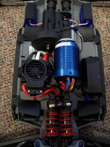 i finished the install of the new motor, hid the wires, and made a new dean "T" with the wires snaked under the rear shock mount, the lipo wires will be shortened to where they barely plug in and fit in the tray for some very neat and tight wiring.