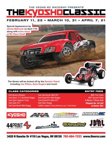 Hey RC-Monster! Just wanted to remind all the readers that Round 2 of The Kyosho Classic at The Vegas RC Raceway is this Saturday at 4pm! Make sure to bring a fold up table, as on the 1st round we had 121 entries. For more info call Eric at The Vegas RC Raceway, at 702-684-RACE(7223), or you can also call him on his cell at 702-764-7259. Thankfully, you can also see the attached flier for more details as well (as I had a hard time downloading documents on the other forum sites, but it worked fine here:) Amber