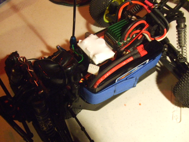 I snaped a shot of the motor and battery mount the blue aluminum diff mount is off my CRT with the buggy diff tubes it's 2 pc's and clamps the diff bearing so I can put the diff in and set the pinion & spur mesh with the motor and diff out of the chassis.:027:
