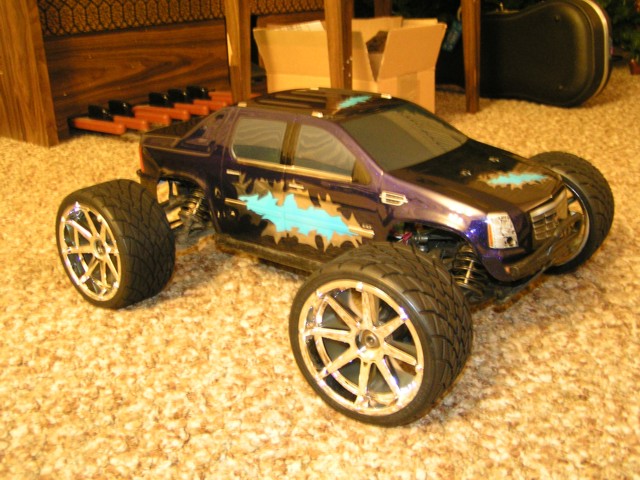 I have seen quite a few people asking questions about the Muggy lately, so I thought I would share mine. I had already done a 1/8th scale buggy for the track and wanted a basher. I could not decide on a monster truck or a truggy, so the Muggy kind of split the difference. I also prefer a center diff over the transmissions in the monster trucks, so that sealed the deal. I also like the way the mudguards on my buggy keep the crap out, and the Muggy had that as an option too. The Cadillac Escalade body really hugs the mudguards well and keeps all the crap out.