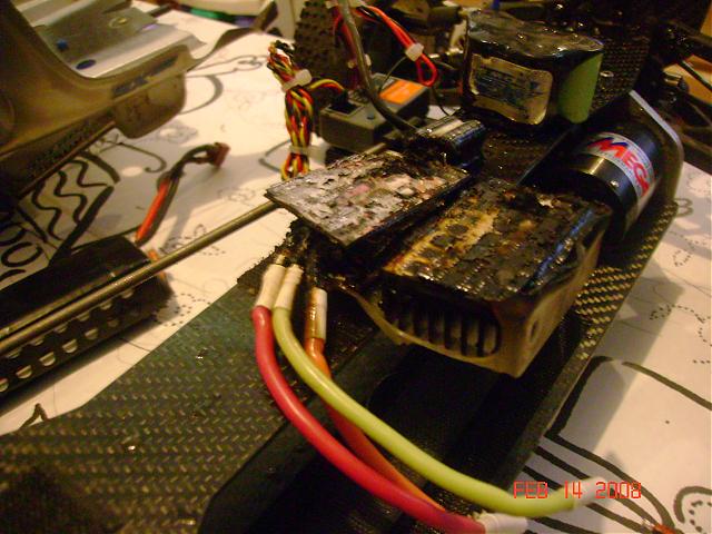 . That's when I didn't hesitate and went running towards the truck took the body off and unplugged everything. The flames happened very fast and you can see it almost burned the body and the wires from one of the packs. The Velcro straps melted in a couple of spots. Man, I was loving this controller as all I heard from others was the horrible stories of it catching on fire. So if you have a Schulze and your vehicle rolls backwards, don't hit the throttle. Wait until it comes to a complete stop