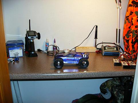 Old coffee table is now a work bench, complete with swivelling vice. Shelf has the batts and a few other bits on it; anyone want/need half an emaxx tranny? Cordless drill and toolbox under the bench, along with the blue and yellow organisers that house screws and assorted spares/field tools. CD tower has lots of plastic tubs that contain varies bits of electrical crap, like wires and fans etc etc. Charger lives in the kitchen...