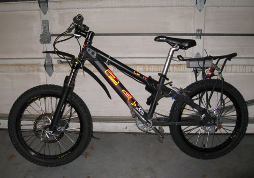Thought I would post up another little project of mine. This guy is my campus cruiser. same hub motor as on my downhill bike, but laced into a 16" wheel and overvolted to 24s a123. Mighty powerful!