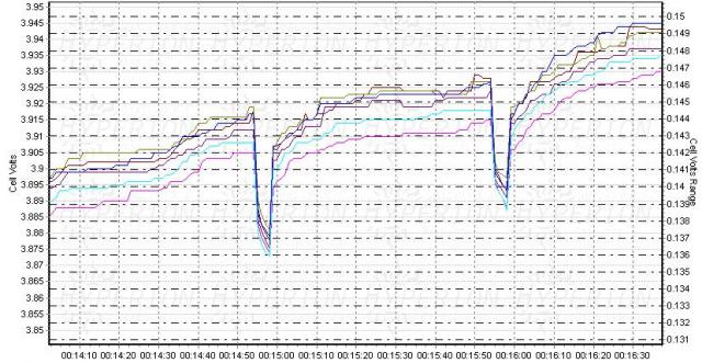 there are two groups of curves, cell 1/4/6 (brown/pink/dark blue) presents far higher voltage under 7A charge current, unless during charge pause period they get close. The "spikes" are 3 second charge pause every minute, you can see the "bad" cells have huge spikes compared to the good cells, reflecting much higher internal resistance.