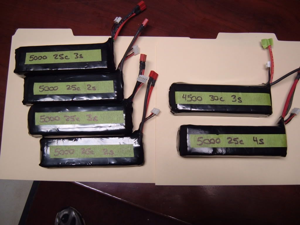 Here a quick pic of some lipos I just finished. The 4 on the lest are a broken up 10s pack- 2 2s and 23s packs. The other 2 were packs with one damaged cell that I removed.