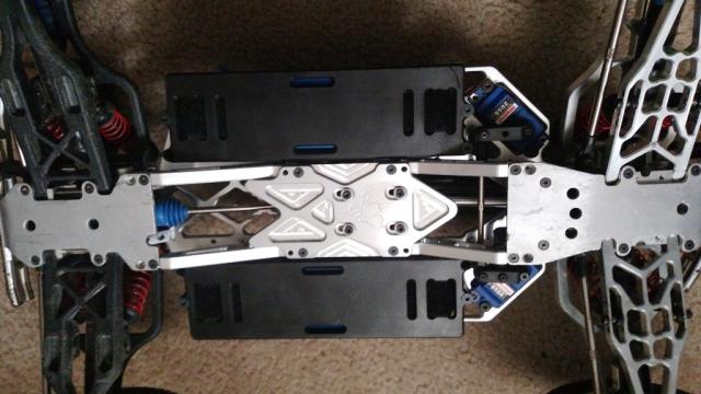The mounting setup for the center diff is slotted to allow optimal dogbone fitment as well as accommodate various differential sizes. The truck in the picture is just a build dummy, so it has stock diffs. The skid locates the mount to accept the Traxxas rear steel center cvd with an aluminum front dogbone(85mm pin to pin is ideal length).
