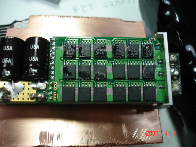 Also, i think heat will bleed through the PCB and trhought the bottom FET's and then the heatsink, as the traces and PCB are quite thermally conductive after all. The water cooled units only have tubes on the side of the PCB's, and they seem to work very well...