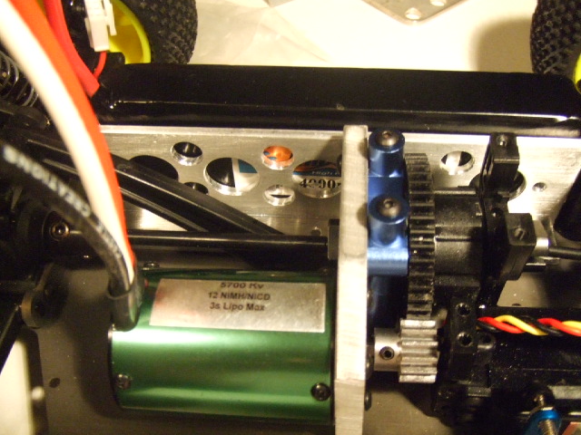 I went with the Kyosho 46t spur to keep the pinions reliable I stole some parts off my full size CRT the rear aluminum diff mount and drive cup and pin for the diff gear along with the front center shaft off my HPI savage. I also moved the center diff over to the right side of the chassis to get the battery closer to the centerline and also allow more room for a 4-5s pack later.:)
