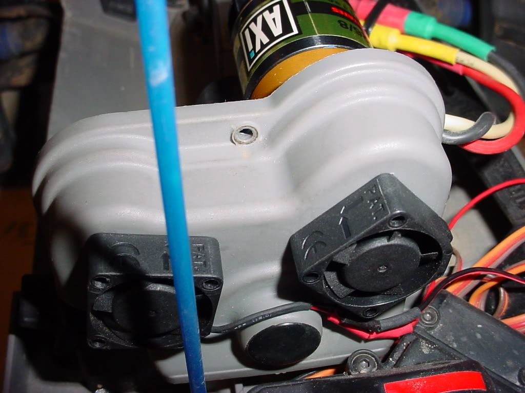 Here is a mod that I did to the E maxx. These fans help cool the slipper clutch area and also blow air on the other side of the motor plate.