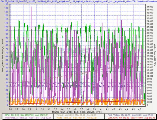i tested 2 5s SLS 4000mAh lipos from a friend of mine wired in parallel on this run. AVG voltage 18-20V depending the state of discharge. Compared to the 7s2p A123 pack punch felt slightly better but top speed was slightly slower. Power levels remained comparable to the A123 pack: 600W avg and up to 2.6KW peak. With 7000mAh discharged a runtime of up to 14 minute is possible. Shortly after this test i ordered 2 6s 3600mAh lipos which will be paralleled too.