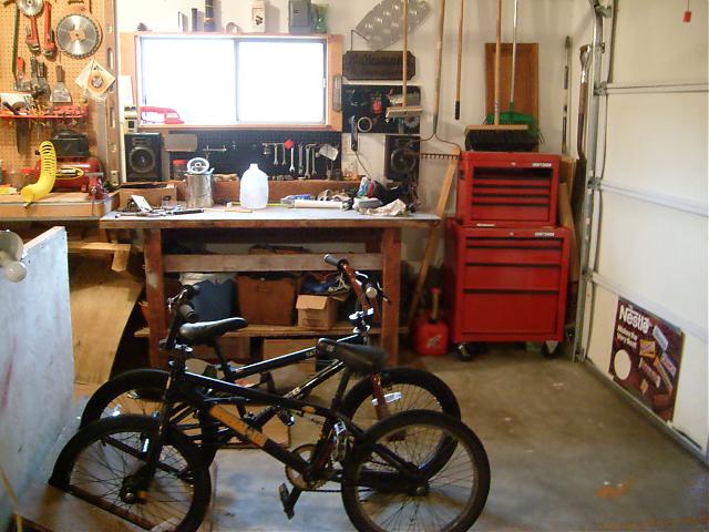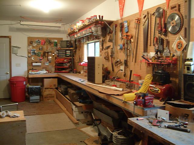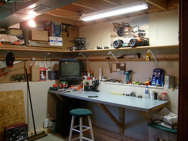 I want to stress the importance of a good, large, workbench. My dad put in all the shelving when we moved in and we both love it. Here is what our garage is like. The third stall is converted into a shop. Not for RC's, but is has a radio for sittin around in the summer and a good place for spud guns...