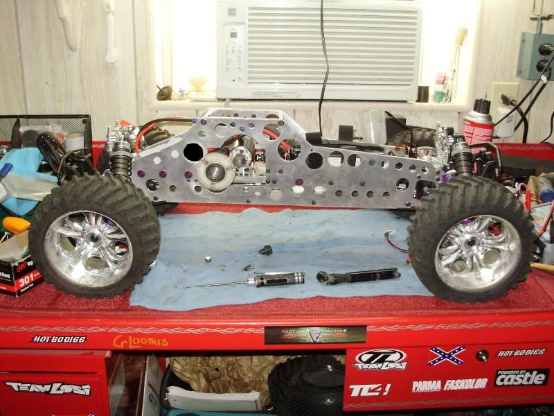 It is truely a unique RC and I had a lot of fun building it but I will be selling it soon to whom ever might be interested in a large scale Savage. I'm gonna play and tinker with it another week or two when I can make time and then I'm going to break it down to a XL size w/CD (possible slipperential?) and sell the chassis and skid plate.