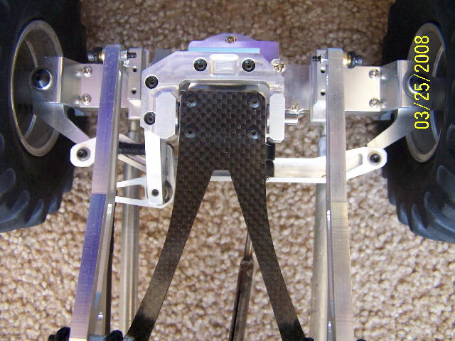 CNC machined steering components. The servos are mounted inboard rather than on the axle housings. This makes for a very uncluttered axle. The belcranks also pivot on large 5X11 bears (two per belcrank).